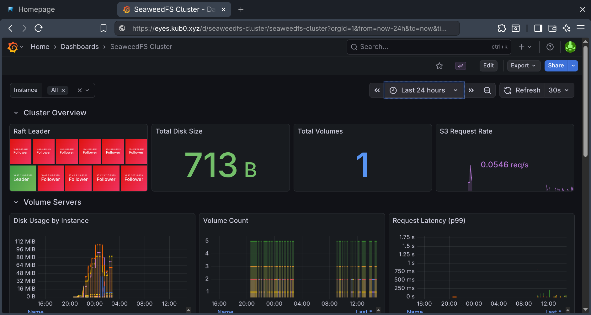 The custom SeaweedFS dashboard: volume server disk usage, S3 request rates, Raft leader status, and resource consumption across all nine pods.