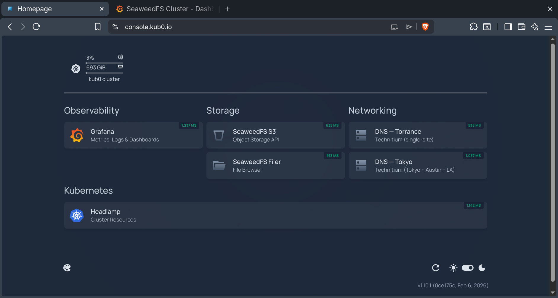 The cluster now has a skeleton (LINSTOR), a circulatory system (SeaweedFS), eyes (Mimir), a voice (Loki), a nervous system (OTel Collector), and skin (Traefik + cert-manager + Homepage) — all accessible through a single portal at console.kub0.io, behind Tailscale, with real TLS certificates. The 47 terabytes aren’t raw capacity anymore. They’re the body of something alive, monitored, addressable, and waiting to be fed.