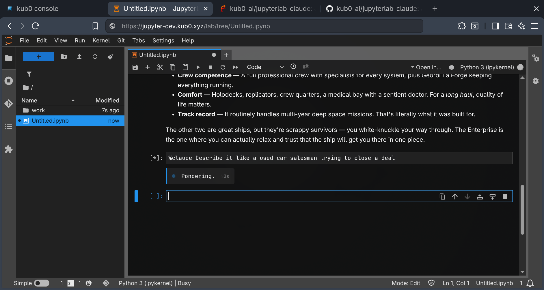 It’s not an assistant sidebar. It’s not a chat window bolted onto an IDE. It’s a computational environment where natural language, Python, and container runtimes share the same execution context. The notebook cell is the interface. The terminal is the workshop. The kernel is the session boundary. The PVC is the memory.