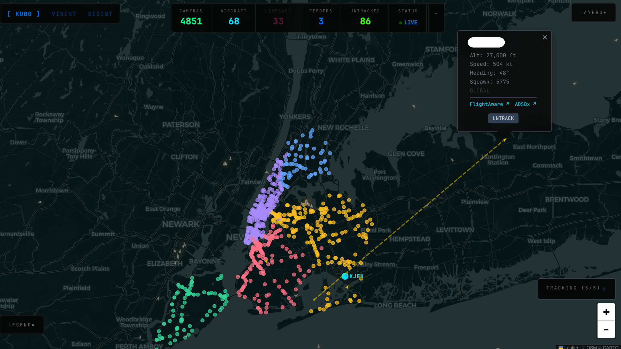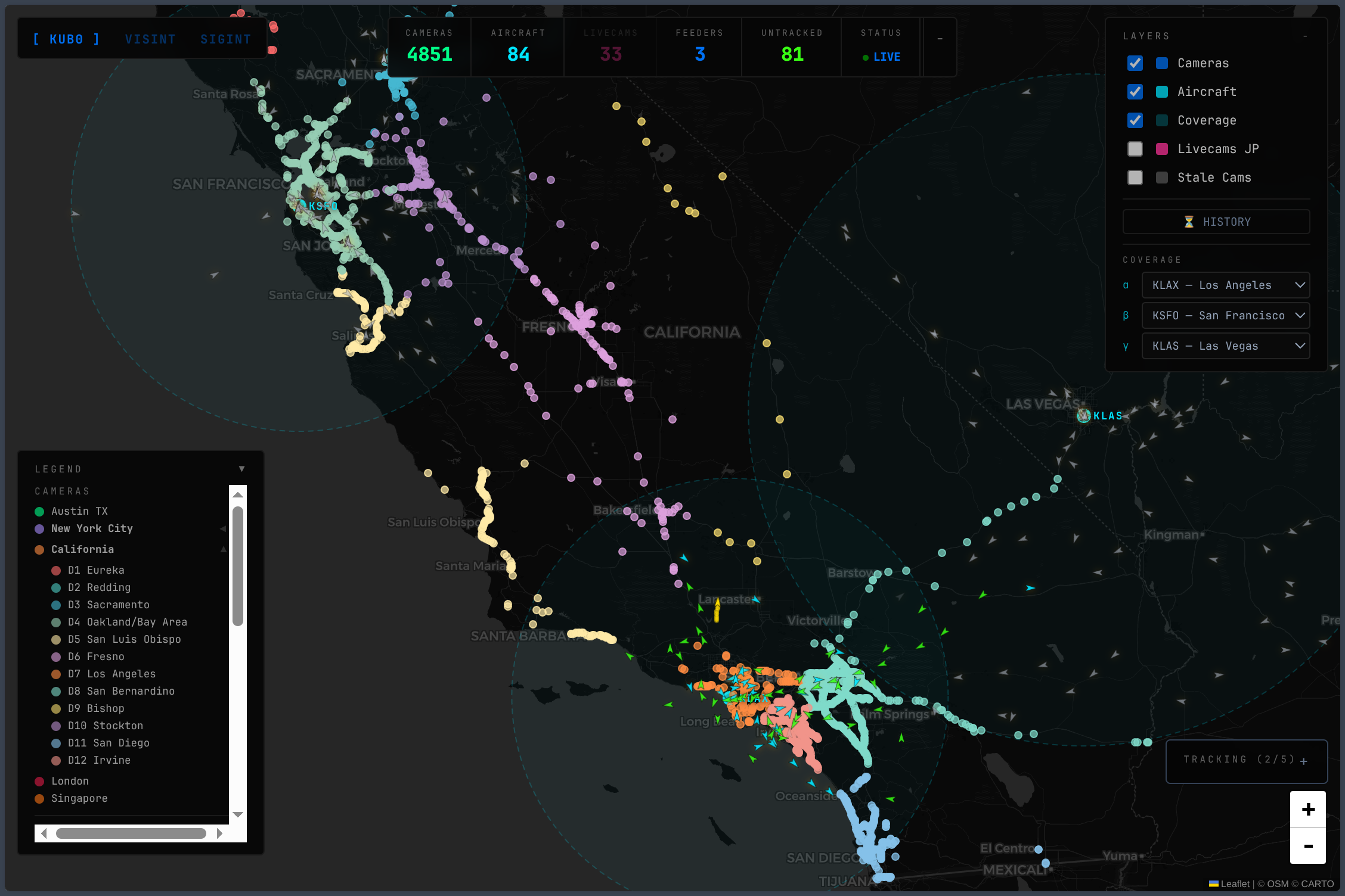 intel.kub0.ai is a full-viewport Leaflet map on dark CartoDB tiles. Two data layers, two refresh cycles, one canvas.