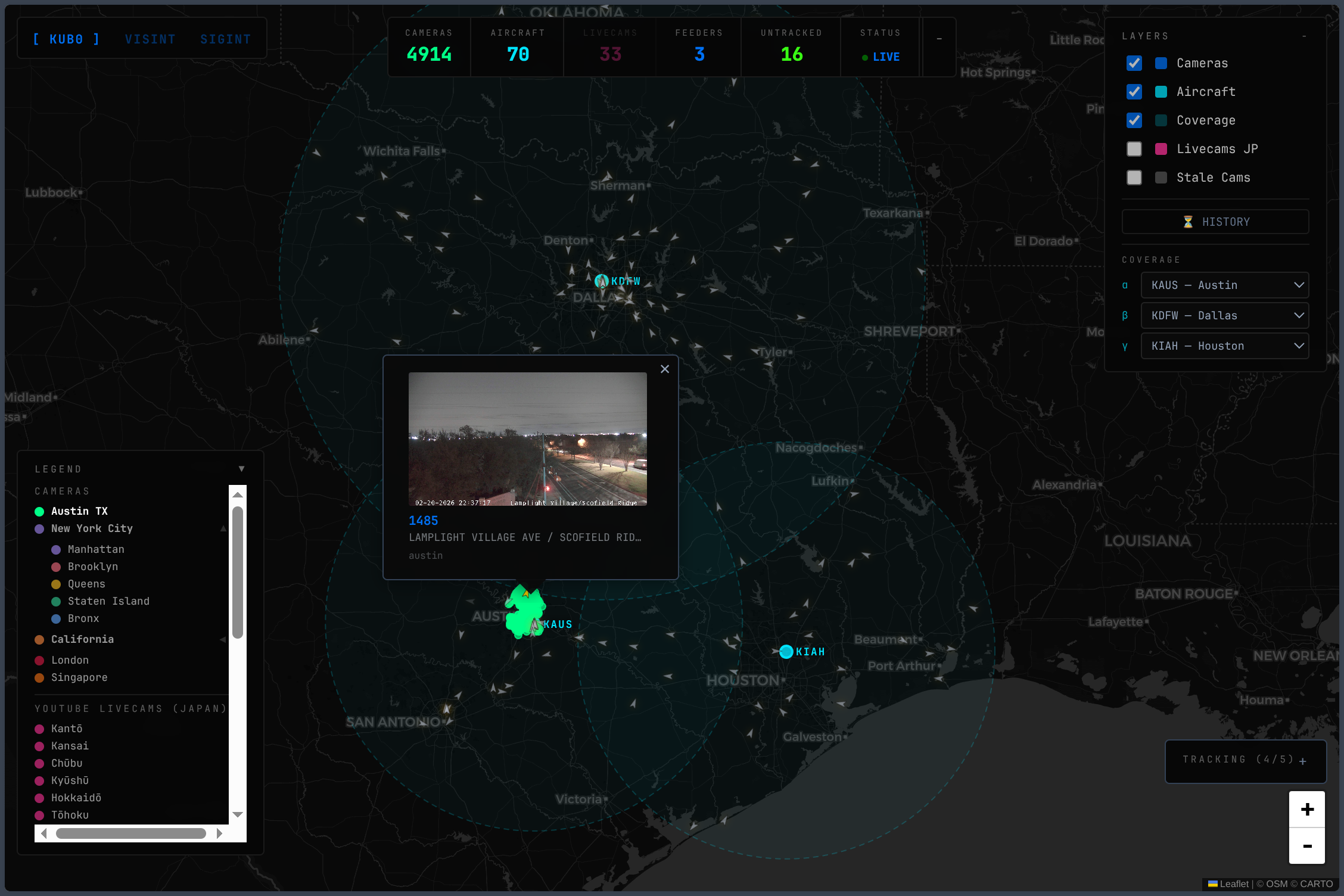 6,081 cameras across three countries on a dark map. SVG plane icons rotating by heading, refreshing every five seconds. Coverage rings over Austin, LA, and Tokyo — three SDR receivers, three windows into the sky.